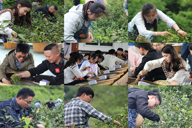 大家抵达山间茶地后,在茶农的指导下拎起竹篮,撸起袖子,热火朝天的分区域开展。他们中有第一次采摘的“小白”,也有精通采茶制茶工艺的行家里手。“一芽一叶一抹香,一人一篓采茶忙”,在采摘中,大家体会到了茶农的辛苦与茶叶的来之不易。