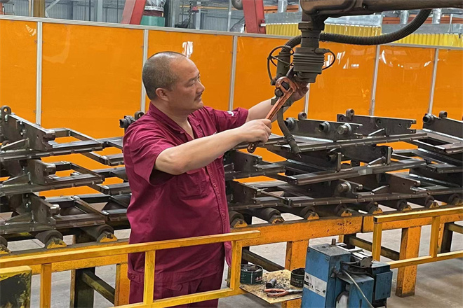 门架交检用吊钩起吊和翻身容易脱落伤人,他连续几天到现场,反复进行试验和改进,最后根据门架槽钢的特殊结构,研究出了用三爪锚定进行固定门架,解决了这一重大安全隐患。他还按照车架焊接变位器的工作原理,自己研发并制作了油箱焊接变位器,避免行车吊油箱翻身滑落的风险,大大减少了安全隐患。他经常跟我们说:“要勤动手,好动脑,不断学习和实践,才能提高自己的能力,增加自己的经验,从而提升自己的价值。”