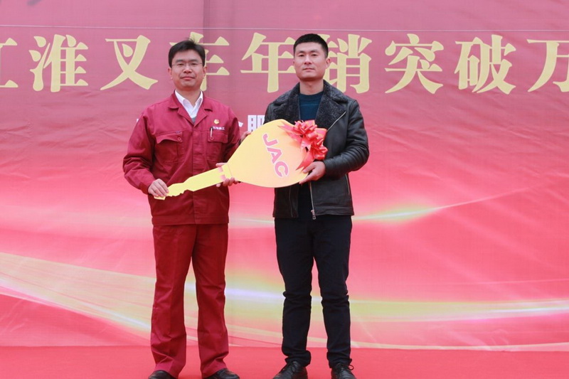 江淮重工持续多年的稳健发展,离不开广大用户的厚爱青睐和经销商的鼎力支持。庆典现场公司副总经理、党委副书记黄李平将2017年度第10000台叉车的“金钥匙”交付给安徽夯实物流有限公司谢松浩总经理,代表着广大用户对江淮叉车支持和信赖的见证。优秀经销商代表合肥迅时汽车贸易有限公司孙宏斌总经理在发言中,就合作历程和感悟表达了对江淮重工公司坚持以客户需求为导向的认同,以及与江淮长期合作的意愿。